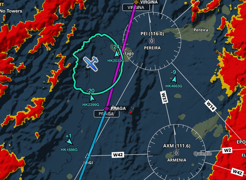 And so quiet. Quiet? I had lost radio contact with Medellin. Apparently, 6500 is too low to stay in contact. Couldn't reach anybody for a while. North of Pereira I called Matecana Tower and they sent me to Pereira Approach. Necessary, because traffic was picking up, as I could see on my ADS-B In enabled tablet. Got vectors around the traffic. Frequency was busy like Kennedy approach. Had to deviate from an assigned heading to avoid terrain and from a cleared altitude to avoid the clouds and couldn't tell him. But I saw all the traffic and could guess for most of them what they were doing, so I chose my path to stay out of trouble. It worked. South of Armenia, everything went back to normal.