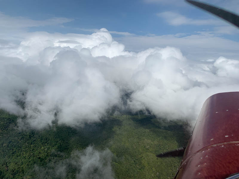 Small shabby settlements at the rivers. No visible roads. Most of these settlements are probably only reachable by boat. Flew over clouds, most of the time. Typical for a rainforest, I guess. Closer to the coast, some larger villages appeared. All next to a river, still no roads, but a few even had runways. In the radio, I heard the police helicopters in their working areas.