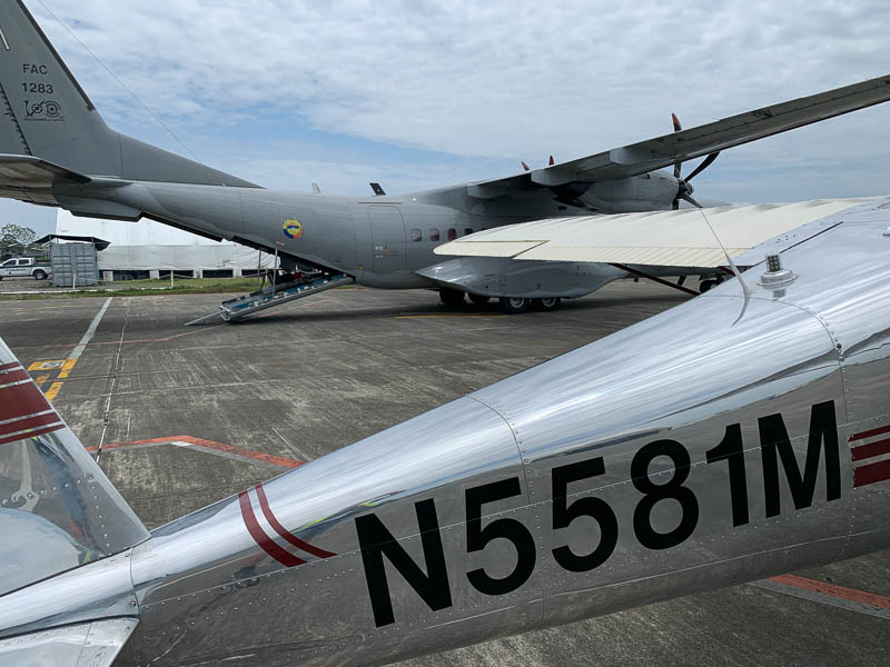 The airport looked like an airbase, I only saw military aircraft and men in uniform, no civilians. Tower asked me to park close to a Casa 235. Expected the worst, but nobody came. Looking for a toilet, I strolled along the whole airbase but couldn't find one.