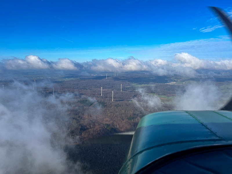 Between Reichelsheim and Dahlemer Binz (EDKV) are the Taunus mountains. I didn't dare to climb above the clouds, but preferred to circumnavigate the wind turbines above the tree tops. NC3514V safely reached her new (temporary) home in Dahlemer Binz. She has to wait here, until I am back from South America.