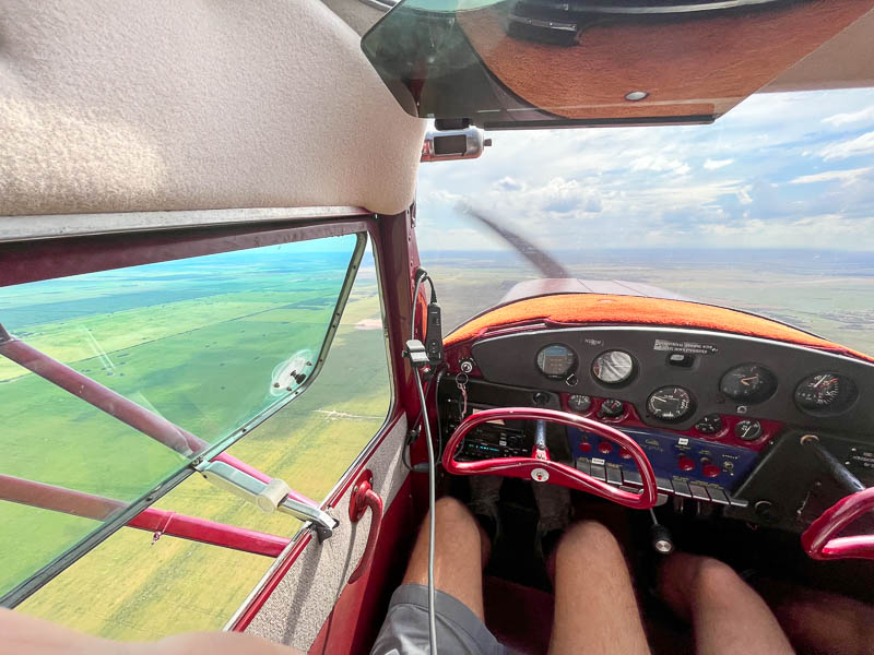 From Matanza we flew to Vedia, basically following ruta 7, the highway from Buenos Aires to Mendoza, which follows the old railway tracks. Terrestrial navigation was very easy, weather was nice, winds light, the machine performed flawlessly and with increasing temperature we increased our altitude, to keep temperatures comfortable. The 140 rudder is sensible. Hiking boots are not good for flying a taildragger, in cruise it is much more comfortable to fly with socks: